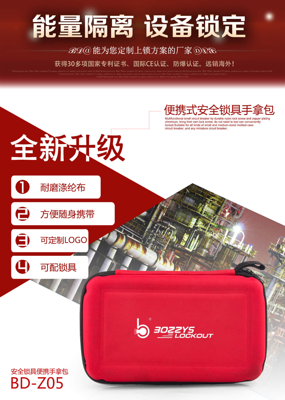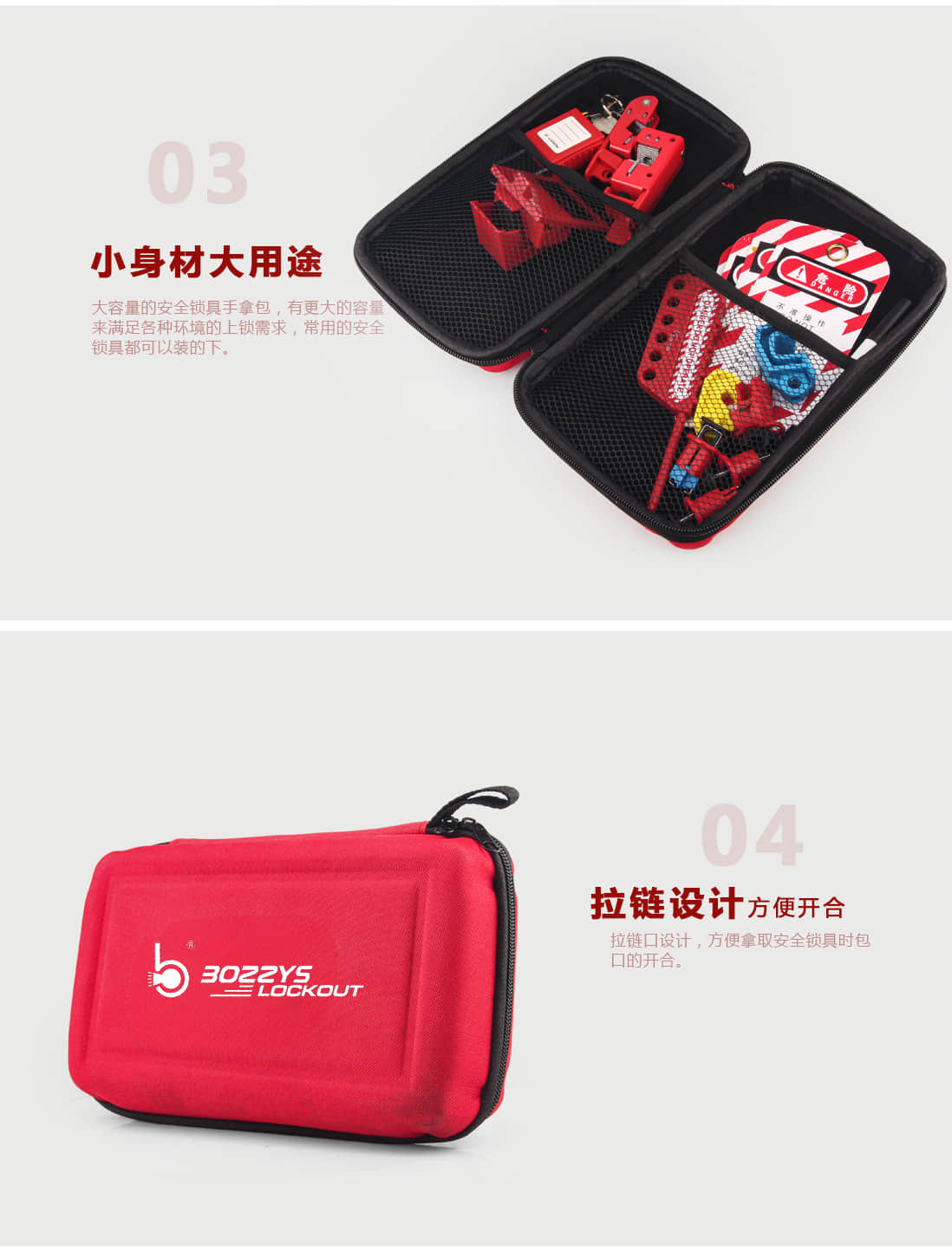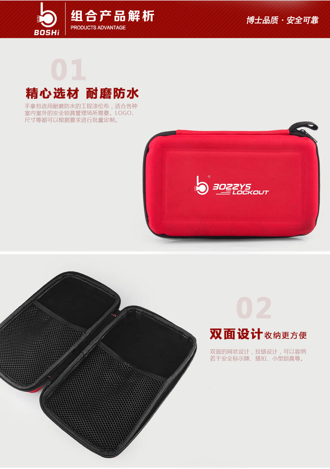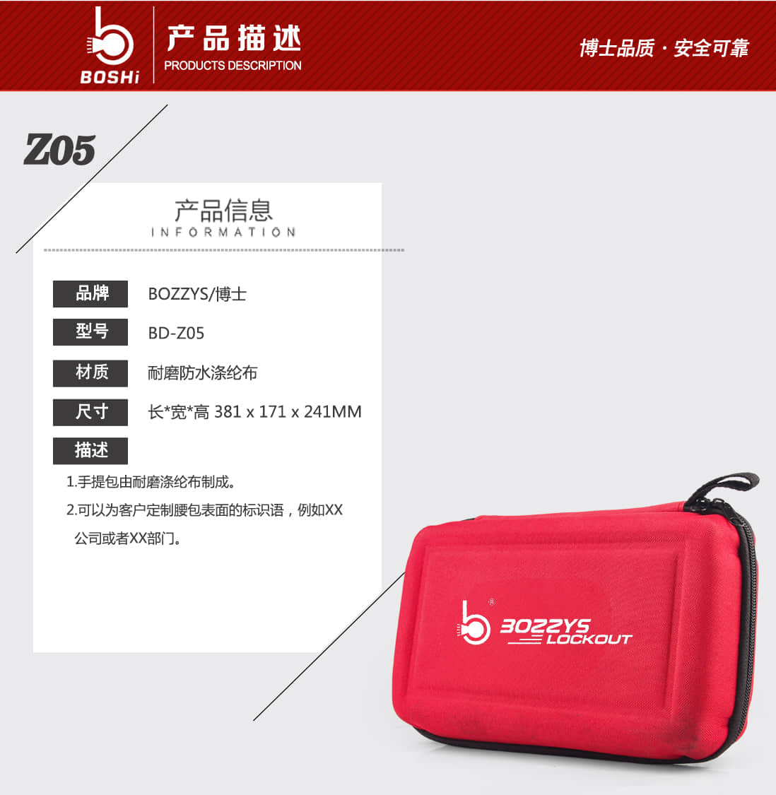 安全锁具手提包BD-Z05A.锁具包由耐磨涤纶布制成。B.可为客户定制锁具包表面的标示内容,例如XX公司或者XX部门。产品编码 展开尺寸BD-Z05 规格:长*宽*高 381*171*241MM