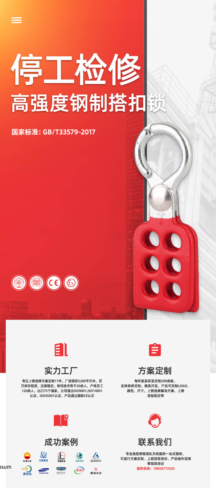 专业生产安全挂锁,安全阀门锁,安全缆绳锁,气动气瓶锁,工业电气锁,安全警示挂牌记忆锁具工作站等,符合OSHA1910.147标准。涉及领域:石油天然气、 化工、电力、核能、物流运输、 机器制造等行业!