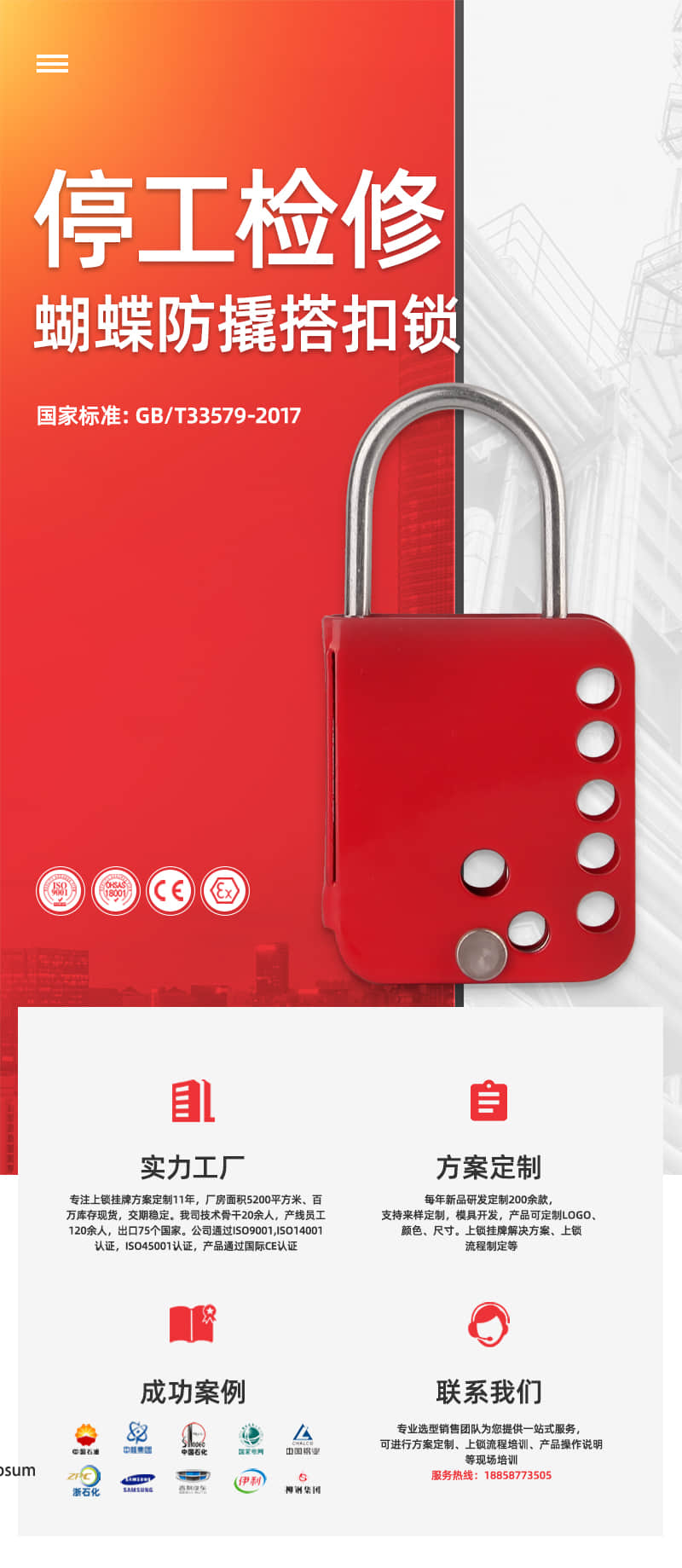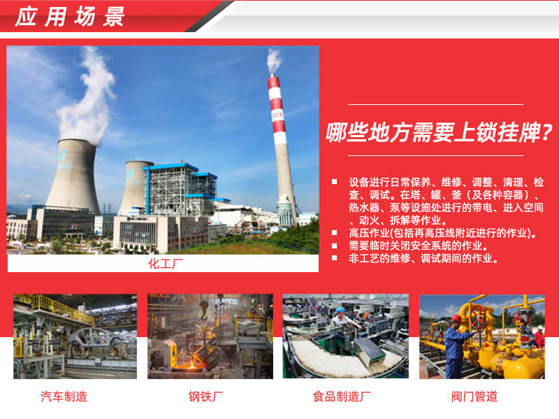 专业生产安全挂锁,安全阀门锁,安全缆绳锁,气动气瓶锁,工业电气锁,安全警示挂牌记忆锁具工作站等,符合OSHA1910.147标准。涉及领域:石油天然气、 化工、电力、核能、物流运输、 机器制造等行业!
