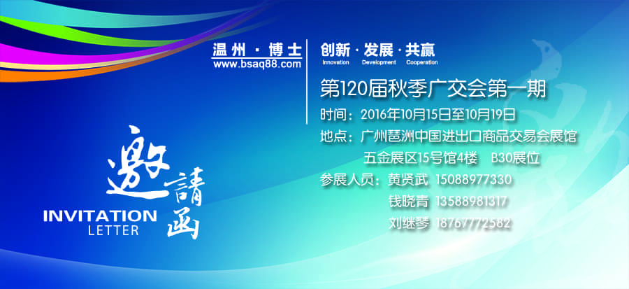 秋季广交会今日( 10月15日)已经正式拉开帷荐,将于10月19日结束,在会场参观者可以前去围观,展厅地址:广州琶洲中国进出口商品交易会展馆五金展区15号馆4楼展位号: B30参展负责人:黄贤武 钱晓青 刘继琴。